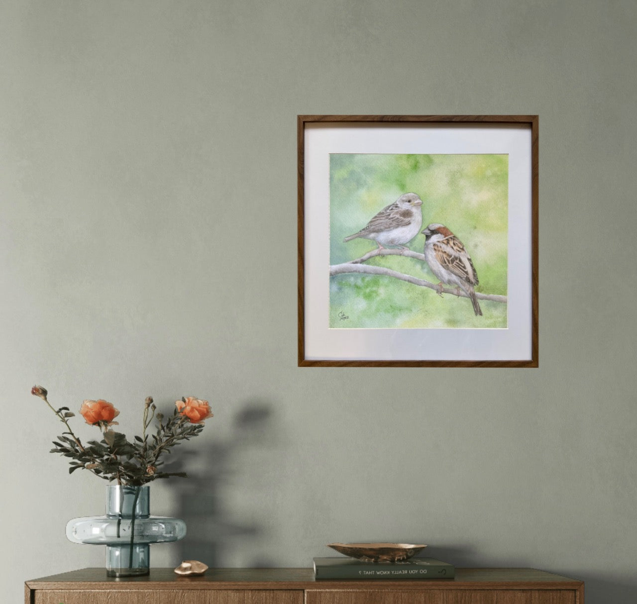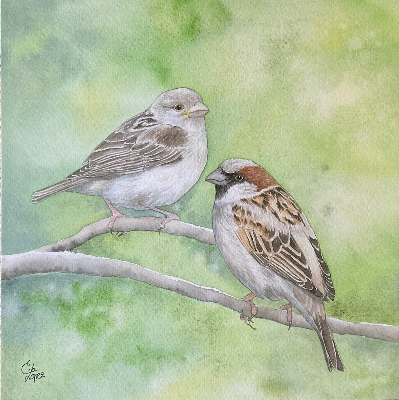 Lámina de gorriones de tamaño 20x20 cm. Impresa sobre papel simulando la textura del papel de acuarela, a partir de ilustración original pintada en acuarela.