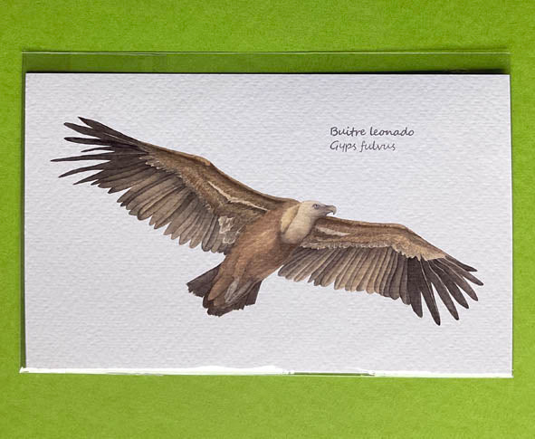 Mini-lámina de tamaño 11x18 cm de buitre leonado (colección Aves de Asturias). Impresa sobre papel simulando la textura del papel de acuarela, a partir de ilustración original pintada en acuarela.