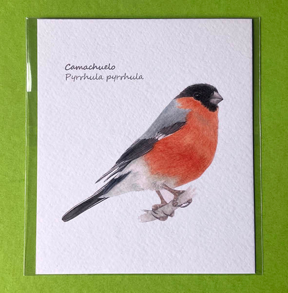 Mini-lámina de tamaño 11x13 cm de camachuelo (colección Aves de Asturias). Impresa sobre papel simulando la textura del papel de acuarela, a partir de ilustración original pintada en acuarela.