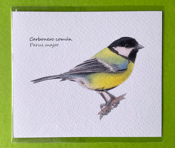 Mini-lámina de tamaño 11x13 cm de carbonero (colección Aves de Asturias). Impresa sobre papel simulando la textura del papel de acuarela, a partir de ilustración original pintada en acuarela.