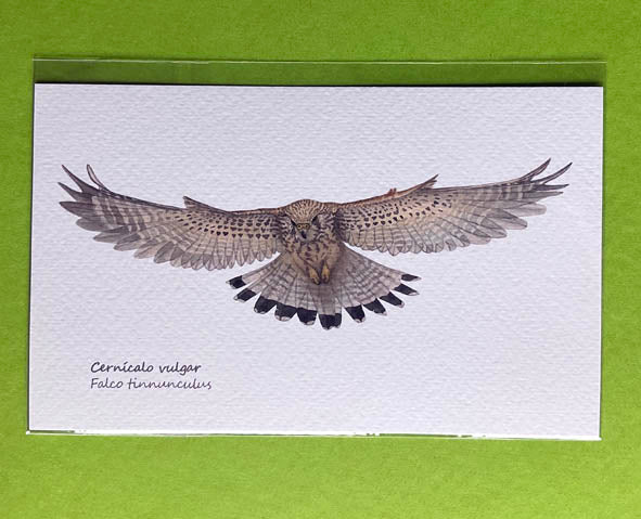 Mini-lámina de tamaño 11x18 cm de cernícalo (colección Aves de Asturias). Impresa sobre papel simulando la textura del papel de acuarela, a partir de ilustración original pintada en acuarela.