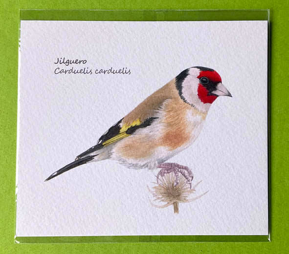 Mini-lámina de tamaño 11x13 cm de jilguero (colección Aves de Asturias). Impresa sobre papel simulando la textura del papel de acuarela, a partir de ilustración original pintada en acuarela.