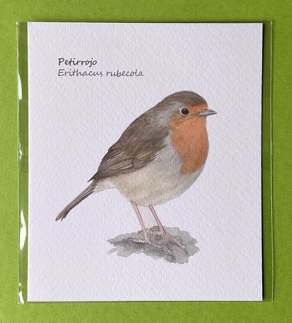 Mini-lámina de tamaño 11x13 cm de petirrojo/raitán (colección Aves de Asturias). Impresa sobre papel simulando la textura del papel de acuarela, a partir de ilustración original pintada en acuarela.