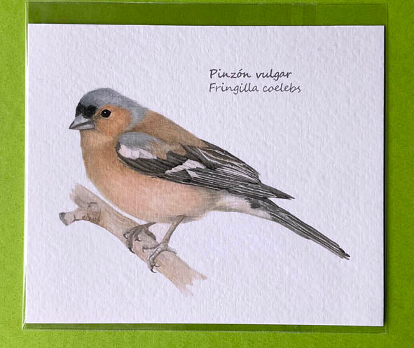 Mini-lámina de tamaño 11x13 cm de pinzón vulgar (colección Aves de Asturias). Impresa sobre papel simulando la textura del papel de acuarela, a partir de ilustración original pintada en acuarela.